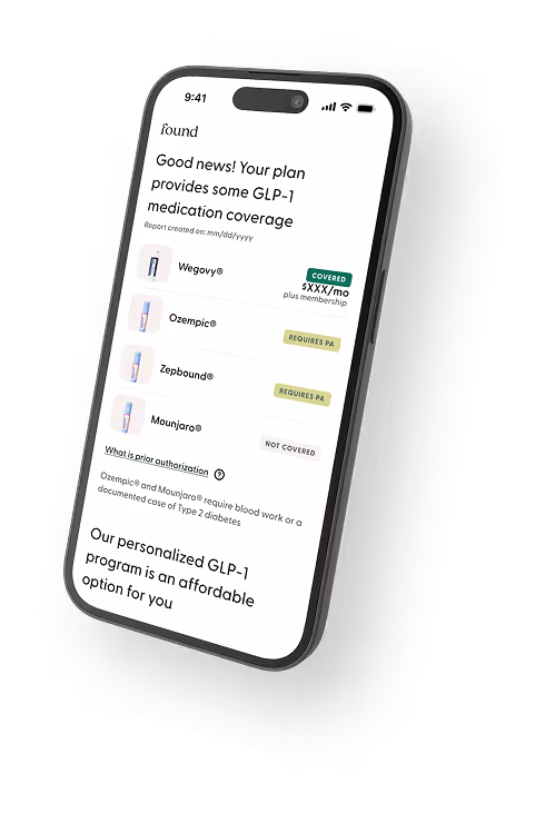 IMPORTANT | *Certain medications are FDA-approved for conditions other than weight. Found is not affiliated with or endorsed by Novo Nordisk A/S., the owner of the registered trademark Ozempic® and Eli Lilly & Co., the owner of the registered trademarks Zepbound®. Insurance coverage, pricing & terms vary. Compounded GLP-1s are not FDA- approved or evaluated for safety or efficacy, and not available in all states. Rx is subject to provider review and clinical eligibility. Copays, coinsurance & deductibles may apply. Imagery for illustrative purposes only. See risk info here and offer terms here.